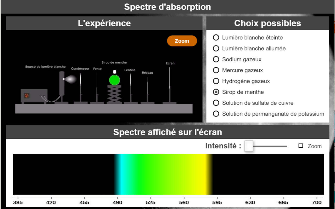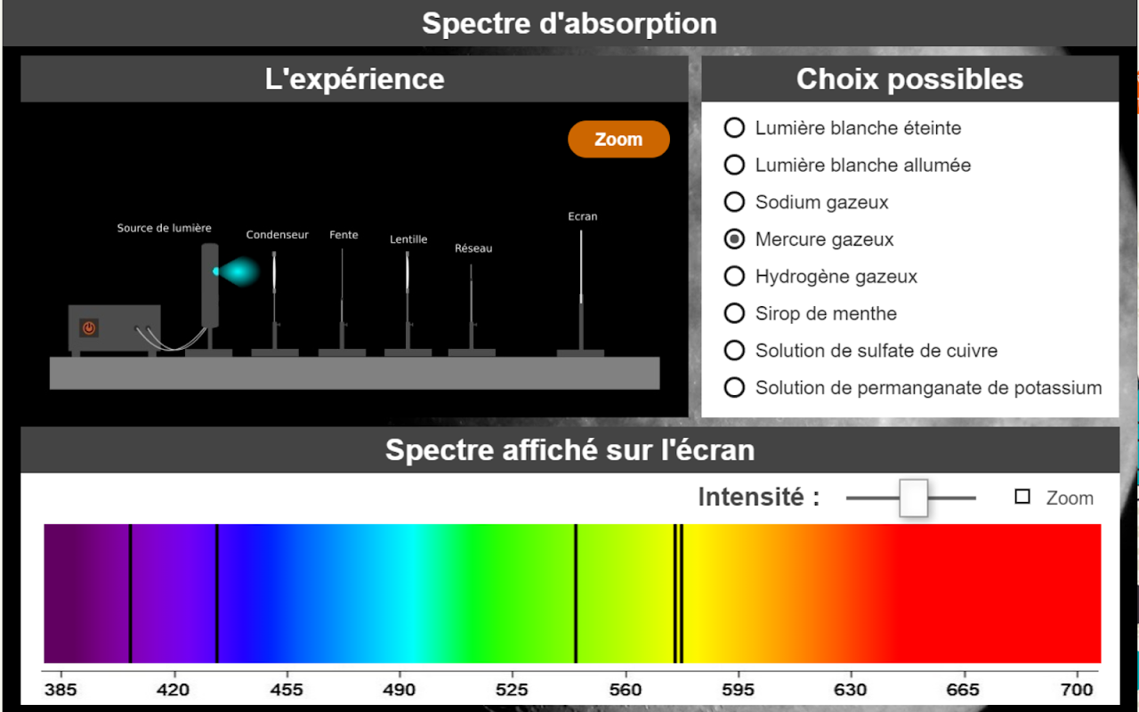 O espectro de absorção de aplicação podem ser observados os espectros de absorção de sódio, mercúrio, hidrogénio, para ver o espectro de luz branca, ou para observar o espectro de absorção (banda) de soluções de sulfato de cobre, xarope de hortelã e permanganato de potássio. Para espectros de sódio, mercúrio e de hidrogénio, é possível alterar a intensidade dos raios e zoom.