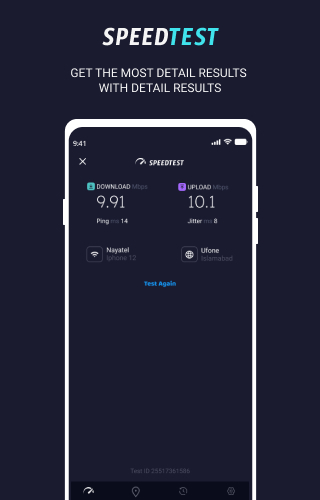 Este verificador de velocidade de internet e wi-fiVelocímetro testa seus downloads, ping de velocidade de upload e os exibe em um formato fácil de ler. Ele pode ser usado para suas conexões de celular LTE, 3G, 5G e umWi-fi analisador para realizar um teste de velocidade wi-fi para pontos de acesso wi-fi.