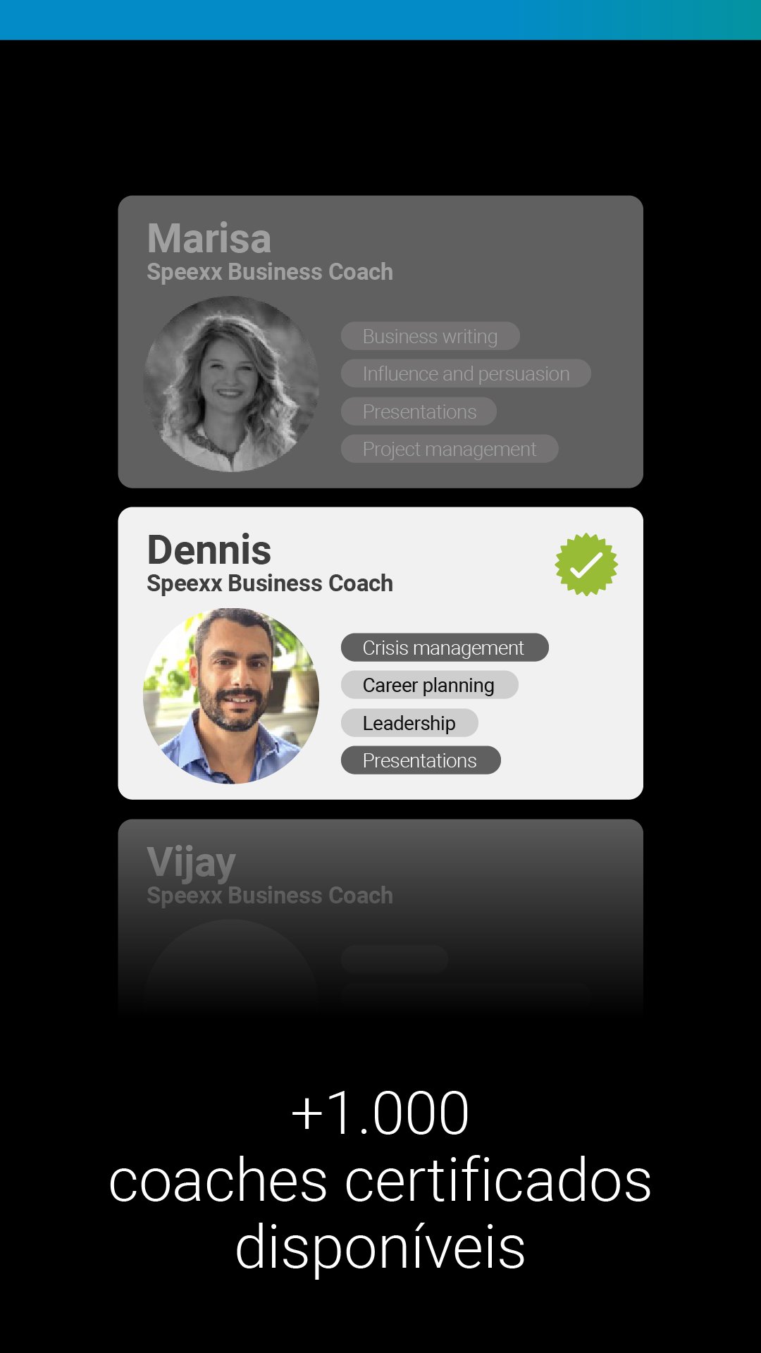 O Speexx Coaching™ foi projetado para liberar todo o seu potencial. Defina seus objetivos e áreas de foco com uma avaliação detalhada. O Speexx Matchmaker™ vai sugerir os melhores perfis entre mais de 1.000 coaches certificados de classe mundial. Escolha e conheça seu coach, acompanhe seu progresso e assuma o controle do seu sucesso.