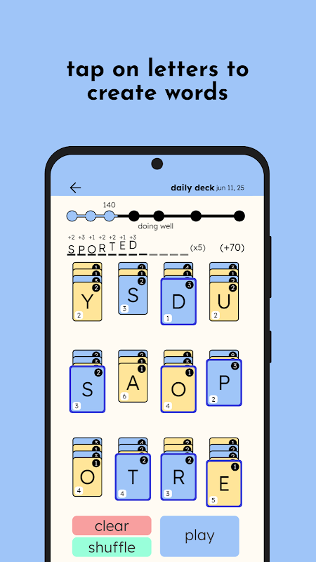 Você recebe uma grade de cartas com letras — cada uma com um valor em pontos e uma dica do que está escondido embaixo. Selecione as cartas do topo das pilhas para formar palavras. As letras usadas desaparecem, revelando o que está por baixo.