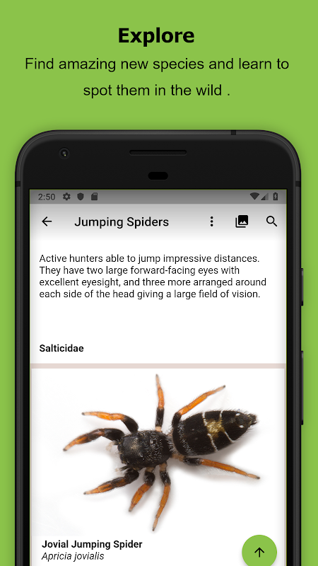Usuários experientes podem navegar em nosso guia de campo por categoria, incluindo habitats e famílias. Em vez disso, pesquise para levá-lo instantaneamente a qualquer espécie no aplicativo, procure termos de glossário ou encontre espécies intimamente relacionadas. O conteúdo complementar explica a anatomia da aranha, elimina mitos, responde a perguntas comuns e muito mais.