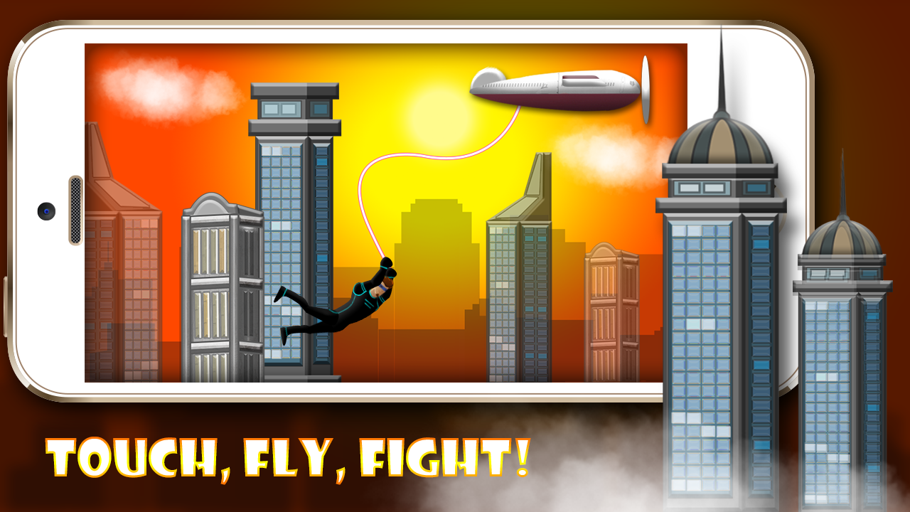 + Toque em um prédio para jogar uma corda e toque em qualquer outro lugar para voar