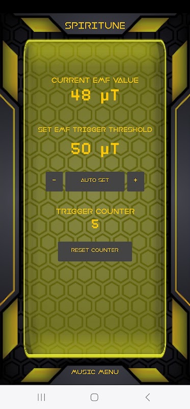 Basta iniciar o aplicativo e colocar seu dispositivo na área que deseja investigar. Anote o valor EMF atual e prossiga para definir o valor limite um pouco acima do valor atual. Este é o seu limite de acionamento, portanto, se por algum motivo o As leituras de EMF ultrapassam esse limite, a música será acionada e reproduzida enquanto a leitura estiver acima do limite. Cada vez que for acionada, o aplicativo será adicionado à contagem de acionadores para que você possa manter anotações dos eventos atuais.