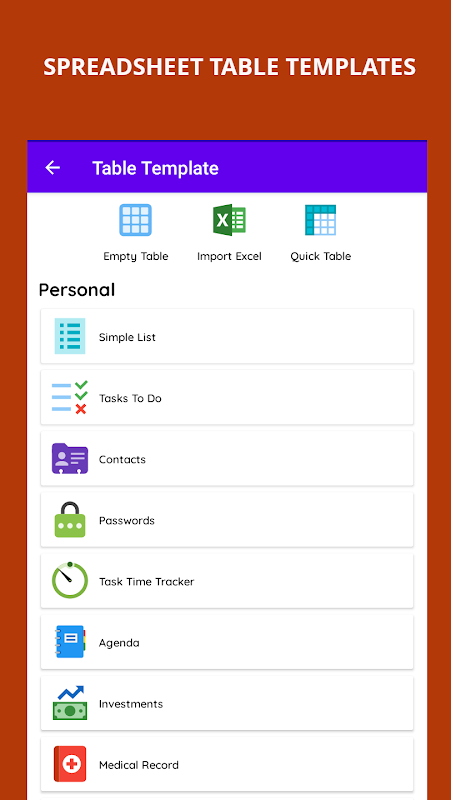 O aplicativo Spreadsheet Table Templates fornece uma maneira fácil de criar um arquivo Excel, arquivo xls, arquivo xlsl ou qualquer planilha a partir de modelos de tabela. Você pode clonar ou criar um modelo de tabela de planilha personalizado de sua escolha.