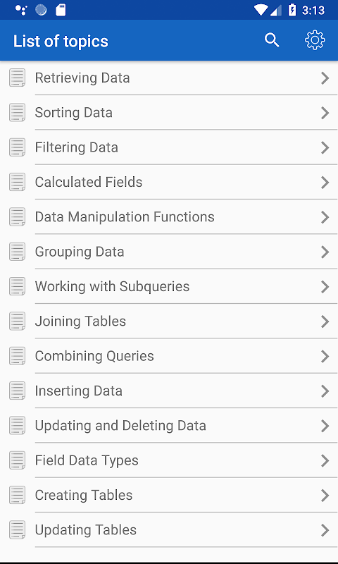 ✓ Aprendendo sintaxe SQL em exemplos de código específicos. Como combinar várias tabelas em uma única consulta? Como classificar o resultado do agrupamento de dados? Que tipos de dados existem no SQL Server? Esses e mais de 150 outros exemplos de código para SQL estão disponíveis no aplicativo.