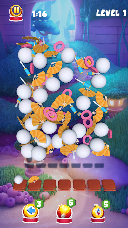 A mecânica principal é a seguinte: toque em um item para coletá-lo e, em seguida, combine 3 itens idênticos para removê-los. Parece fácil — até que sua bandeja tenha apenas 7 espaços. Cada escolha ocupa espaço e a torre continua tentando você com novos itens... enquanto os que você precisa estão enterrados sob outros. Pegue muitas peças diferentes e sua bandeja ficará cheia. Sem espaço, sem combinação, fim de jogo.