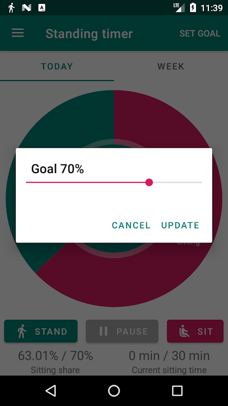 Works both with sit/stand (adjustable) desks or regular work places. User can enter sitting/standing data manually by pressing buttons in application or connect it to supported devices to track sitting time automatically. Application supports goals to improve sitting habits and calculates weekly statistics to see improvement over time.