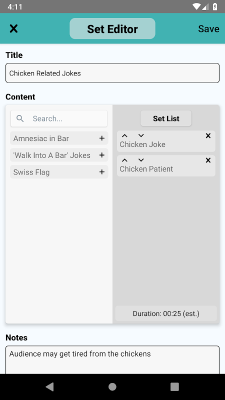 Ele funciona principalmente como um aplicativo de anotações, com funcionalidade extra para melhorar a organização e a capacidade de pesquisa de sua comédia, bem como para agilizar a preparação para apresentações e registrá-las para manutenção e melhoria de registros.
