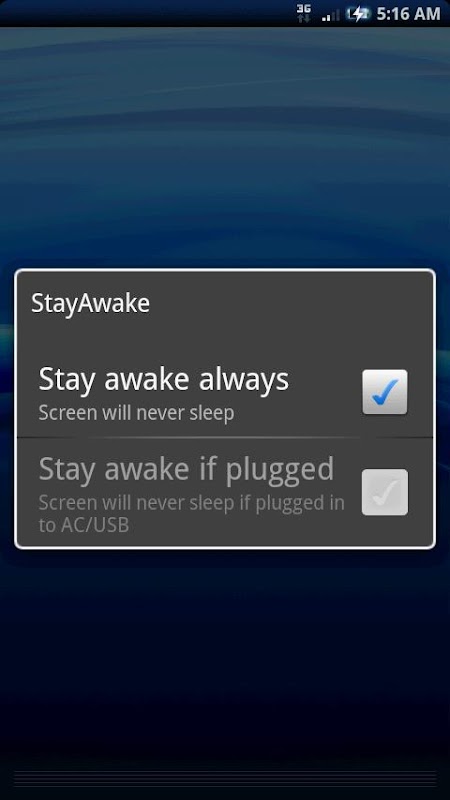 To work the stay awake "if plugged in to AC/USB" mode, please unplug your device from AC/USB and check the box; then plug in again.
