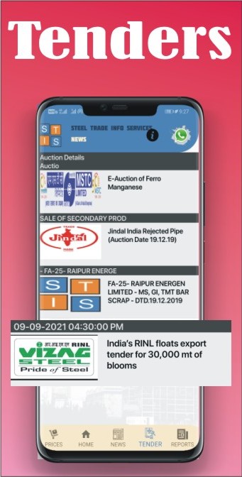 We use to Track the Daily Tender from the Various website of Indian Companies like SAIL, BHEL, TATA, JSPL, E-AUCTION OF COAL, IRON ORE etc and share the same Tender report and every single details related to the Steel & Iron Tenders and share the same via our “Steel Trade” Mobile APP.