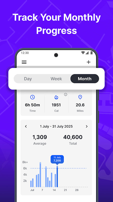 Monitore passos, defina metas, visualize estatísticas e comemore marcos — tudo em um único aplicativo.