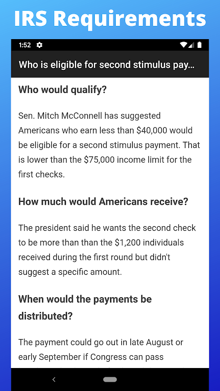 O aplicativo Stimulus Check oferece as últimas notícias sobre o segundo cheque de estímulo e os requisitos do IRS para se qualificar para o cheque e dinheiro gratuitos.