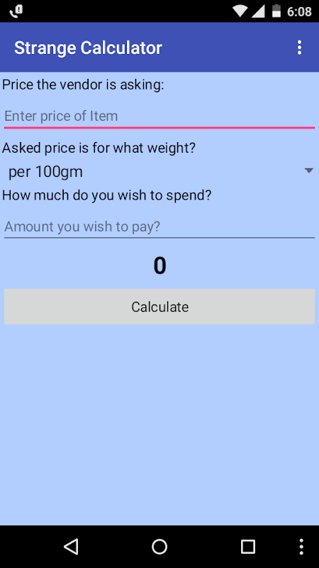 Suppose, a shopkeeper is selling a vegetable at Rs. 30 per kg. And I wish to spend only Rs. 10. In such a situation it becomes difficult for me to calculate how much vegetable will I get for Rs. 10. This is where this app comes in handy. You just need to put the price "30" in the first textbox and select "per 1kg" from the drop down, and lastly enter "10" for the amount you wish to pay in the next textbox. The app calculates how many gms of vegetables will u get for Rs. 10 as soon as u tap the "Calculate" button.