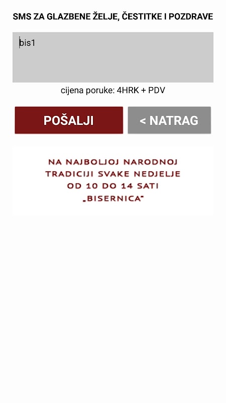 Na melhor tradição folclórica, todos os domingos, das 10h às 14h, o BISERNICA encontra seus ouvintes através da tamburitza e da música dos KUDs e dos grupos de música locais, buscando preservá-lo do esquecimento e transmiti-lo com o mesmo fervor e amor pelas novas gerações.