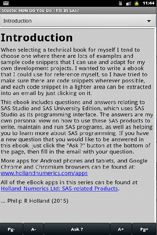 This app, "Studio: How Do You Do This In SAS?", is one of a series of eBooks about SAS software programming focusing on frequently asked questions and answers about SAS Studio and SAS University Edition, illustrated with screenshots, and by code samples which can be sent by email directly from the app. It is designed to encourage users to contribute questions some of which will be included in future versions of the app. There are controls to select specific questions, move to the previous or next question, decrease or increase the font to suit the user's preference, and send emails requesting answers to questions not yet included in that version of the eBook.
