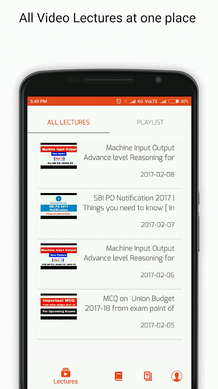 1. Lectures: In this section you get Videos on different topics ie. Quantitative aptitude, General Awareness, Reasoning ability, English, computer etc and you can acces it with a ease. Playlist is also included in it so that you can search the topics and get all videos of that topic on one place.