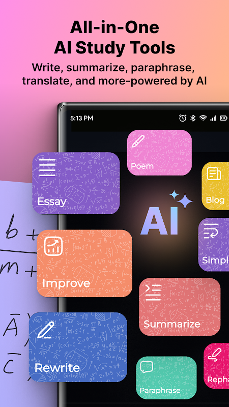 Está com dificuldades com o dever de casa? O StudyAI não apenas resolve problemas, mas também ajuda você a entender, aprender e melhorar suas notas. Seja matemática, ciências ou redação, o StudyAI fornece soluções instantâneas, explicações passo a passo e feedback personalizado, para que você possa estudar mais rápido e se destacar em todas as disciplinas.