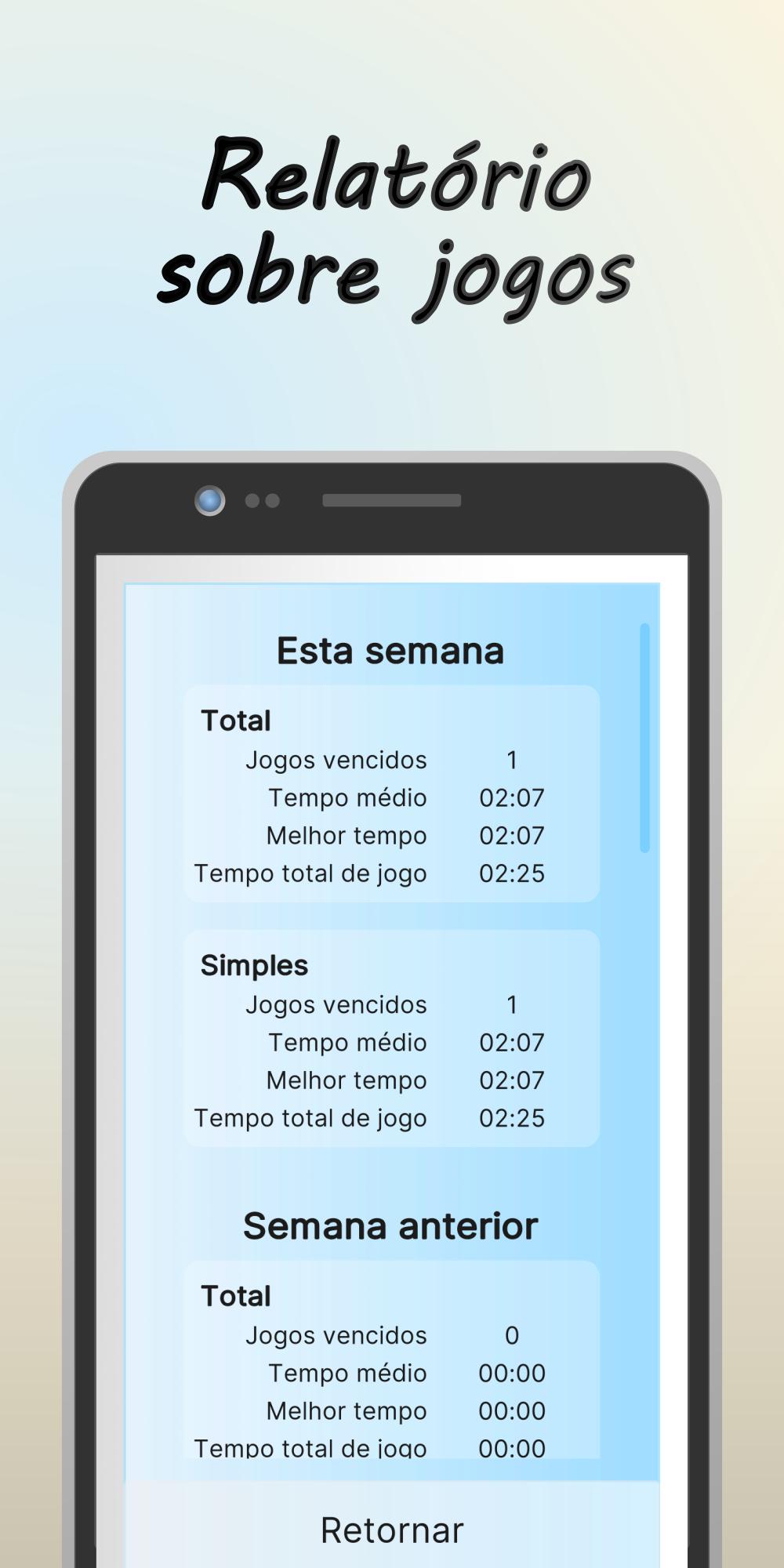 ✓ Relatórios semanais de jogos com os seus melhores e médios tempos
