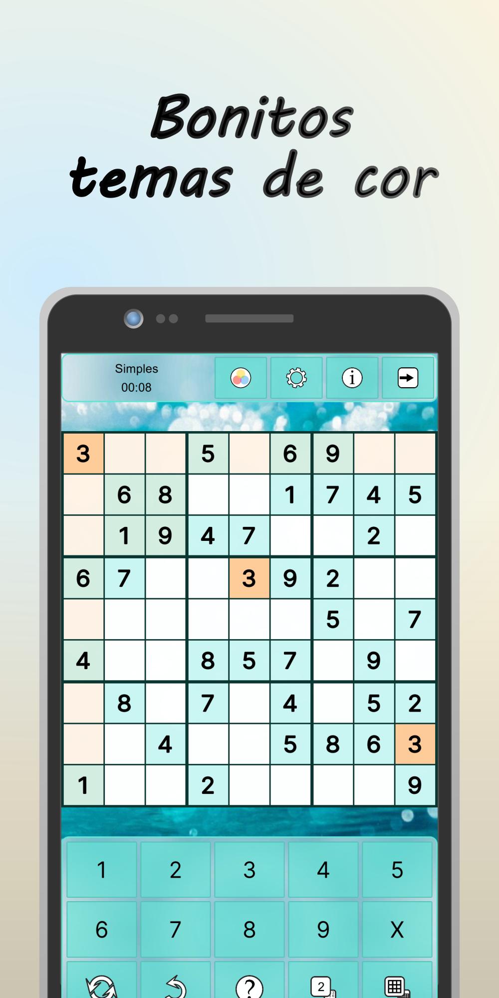 O destaque do sudoku gratuito são os 8 temas de cores diferentes. Há 2 temas de cor clara e simples em azul e verde e 1 tema de cor escura para brincar à noite. Além disso, há temas de cor com imagens de fundo e cores atractivas: Água, Nuvens, Inverno, Deserto e Verão. Seguir-se-ão mais temas de cor!