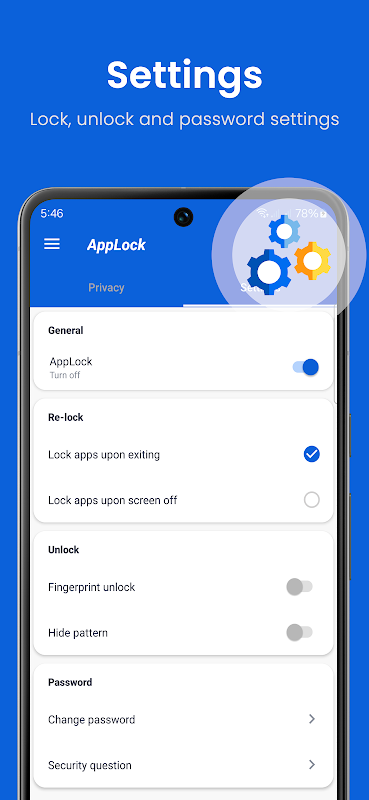 Ele fornece configurações de bloqueio, desbloqueio e alteração de senha.