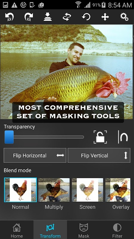Mascaramento na app é o mais poderoso disponível na App Store, basta tocar em uma área da foto, eo aplicativo irá mascarar toda a área conectada com cores semelhantes. Ou você pode usar escova, lasso, semelhança de cores global, retângulo, elipse, linear, bi-linear ou ferramentas de gradiente de mascaramento radiais. Máscara de uma parte com esta ferramenta e que parte da imagem de primeiro plano irá tornar-se transparente e revelar o fundo.