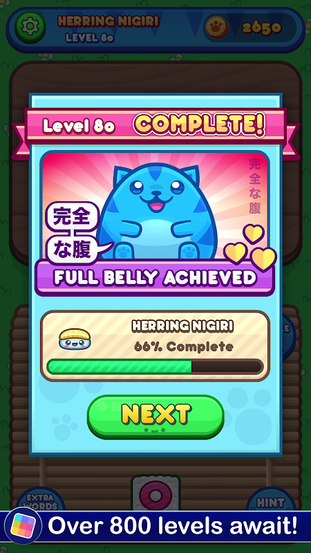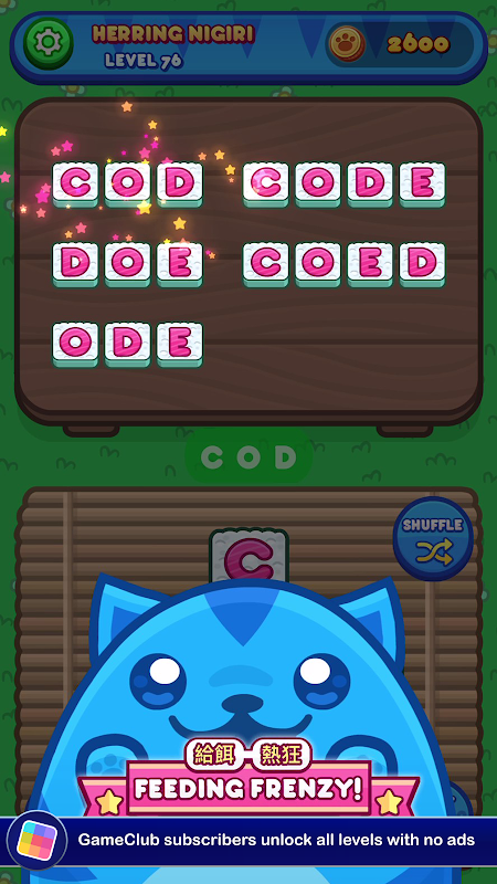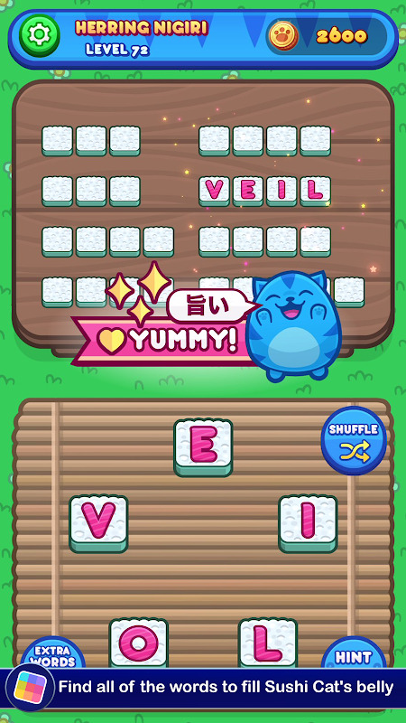 Cada nível oferece um conjunto de letras que você precisa usar para formar palavras. Há um menu definido e você precisará descobrir todas as palavras necessárias para avançar. Se você tiver problemas, poderá obter uma dica em troca de algumas moedas. Você ganhará mais à medida que avança, mas se quiser acumular um estoque, precisará pensar em muitas palavras bônus. Quanto maior o seu vocabulário, mais comida você poderá preparar para o Sushi Cat. Quanto mais Sushi Cat come, mais feliz fica! O sabor da vitória nunca foi tão fresco!