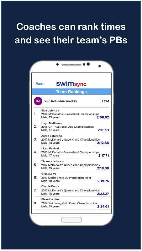 Swimsync é um excelente aplicativo de natação para organizar e acompanhar os tempos de natação de seus nadadores. O aplicativo é projetado para todos os nadadores de piscina e águas abertas. O Swimsync torna mais fácil ver os PBs de todos os seus nadadores, atingir resultados e definir tempos de meta. Os resultados da natação são organizados em encontros, braçadas e distâncias. Você pode ver os melhores tempos de todos os nadadores em uma tela. Os tempos de natação também podem ser salvos em jardas e metros. Fácil de usar e o melhor aplicativo de natação para organizar seus tempos de natação.