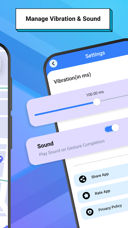 O aplicativo Swipe Back Navigation Gesture oferece a opção de configuração para ATIVAR/DESATIVAR o som do gesto e o tempo de vibração em milissegundos.