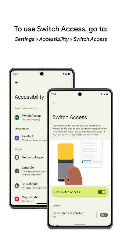 O acesso com interruptor ajuda a interagir com seu dispositivo Android usando um ou mais interruptores em vez da tela touchscreen. Esse recurso é útil para pessoas que não podem interagir diretamente com o dispositivo.