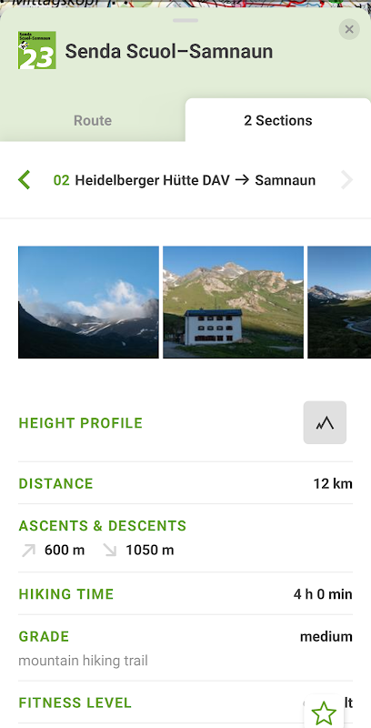 Passeios planejados, seções de mapas e todas as informações de rota estão disponíveis offline no aplicativo. Isto é ideal para terrenos alpinos onde não há recepção de rede. Salve qualquer seção do mapa com o conteúdo que você escolher. Este recurso está disponível para você com SwitzerlandMobility Plus (taxas aplicáveis).
