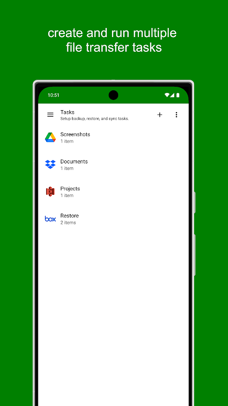 As transferências de arquivos são organizadas em tarefas. Cada tarefa consiste em uma ou mais fontes e uma unidade de destino, permitindo que você execute operações de sincronização, backup ou restauração. Você pode criar várias tarefas, e cada tarefa pode incluir várias fontes.