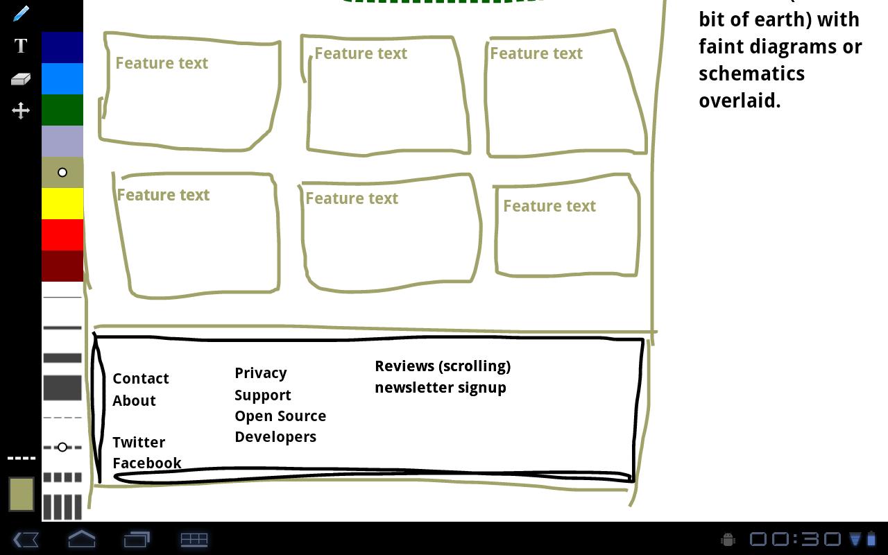 SyncSpace para Android fornece um espaço de desenho com zoom que pode ser compartilhado em tempo real sobre a rede, uma espécie de whiteboard compartilhado. Ativar a sincronização e enviar um link para o documento a outras pessoas que serão capazes de ver o seu desenho e também fazer alterações usando SyncSpace.