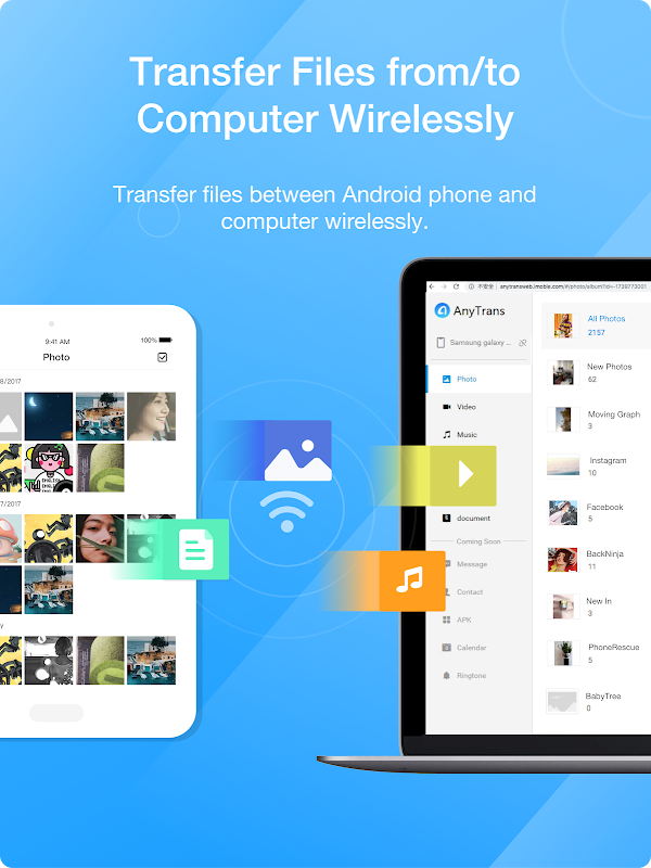 Transfira fotos ou quaisquer arquivos em dispositivos e unidades de nuvem sem fio.