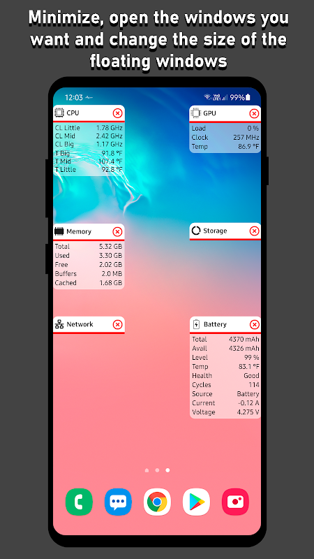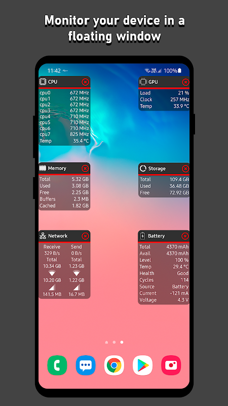This application is a monitoring tool. Shows information about the system on the panel or in floating windows and is a useful tool for users interested in seeing how the device is behaving when running applications.