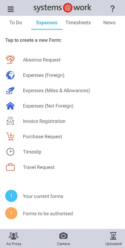 O aplicativo systems @ work permite que os usuários corporativos de expens @ work, time @ work ou forms @ work insiram dados, usando formulários e planilhas de horas definidos em seu banco de dados corporativo.