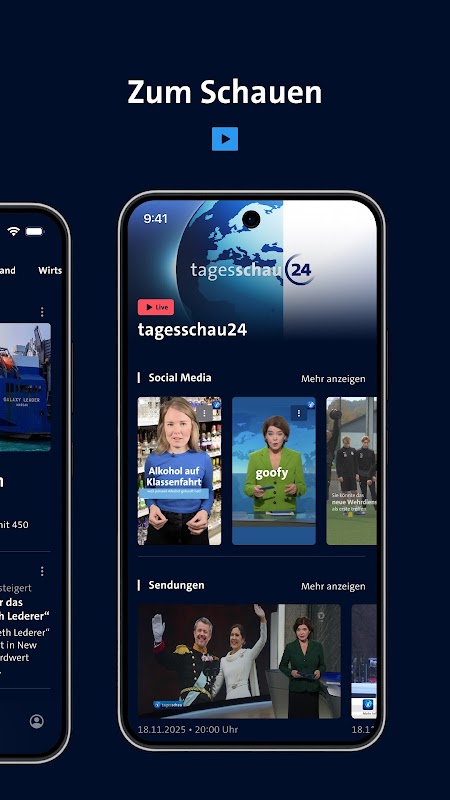 Atrás do ícone de vídeo na barra de navegação do novo aplicativo tagesschau, você encontrará o melhor conteúdo da equipe de mídias sociais do tagesschau. Você também encontrará transmissões ao vivo de programas atuais e vídeos de transmissões anteriores, incluindo tagesschau (também com interpretação em língua de sinais), tagesthemen, tagesschau em Linguagem Fácil e tagesschau24. Para se manter atualizado(a) com as notícias em qualquer lugar, o consagrado "tagesschau em 100 segundos" é perfeito!