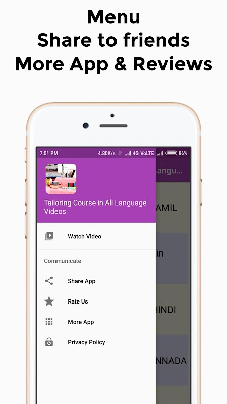 This application included Tailoring Course App in TAMIL ,Tailoring Course App in MALAYALAM,Tailoring Course App in HINDI ,Tailoring Course App in KANNADA,Tailoring Course App in TELUGU,Tailoring Course App in MARATHI,Tailoring Course App in URDU ,One Piece Cutting Stitching Videos,Evening Gown Cutting Stitching Video, TULIP Salwar Cutting and Stitching Videos