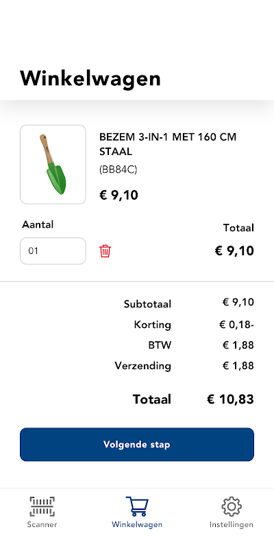 Passe o smartphone pela prateleira de ferramentas de jardim, escaneie os códigos de barras com o leitor de código de barras, digite o número e peça os itens.