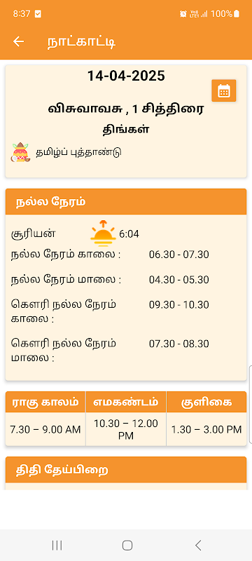 Experimente o tradicional Tamil Panchangam na ponta dos dedos com nosso aplicativo Tamil Panchangam Calendar. Este aplicativo abrangente e fácil de usar traz dados diários essenciais para planejar seu dia, realizar rituais e celebrar festivais.