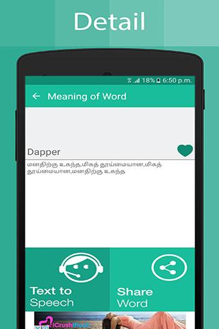 Esta é a melhor aplicação para os iniciantes, você pode aprender diariamente novas palavras com uma facilidade, instalando Inglês para o dicionário Tamil e aplicação de tradução . Este dicionário pode ser usado como Tradutor tâmil e permite grafias, gramática e crianças podem explorar o nome de diferentes partes do corpo, frutas, vegetais, animais e flores. Você também pode salvar sua palavra favorita para fácil referência.