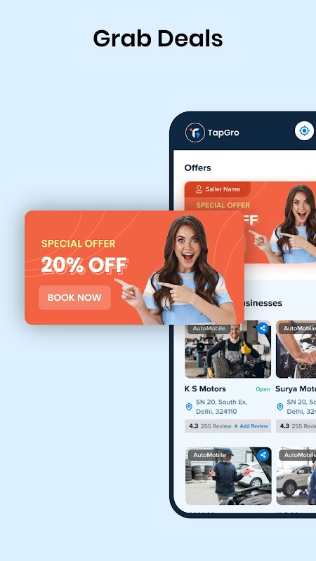 Descubra novos negócios, navegue por suas ofertas e encontre ofertas e descontos interessantes disponíveis exclusivamente na plataforma TapGro. Com uma interface amigável e navegação intuitiva, o TapGro facilita a busca de serviços, a leitura de avaliações e a tomada de decisões informadas.
