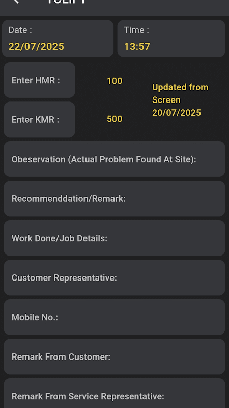 Registro de Solicitação de Serviço: Registre data, hora, HMR, KMR e entradas de campo detalhadas
