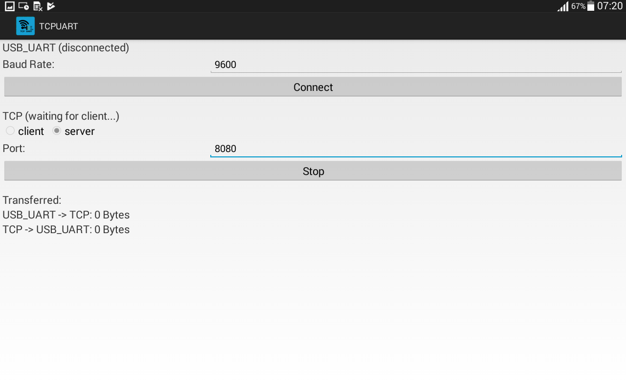Este aplicativo permite conectar um adaptador USB UART (Serial) a um soquete TCP, para enviar e receber dados.