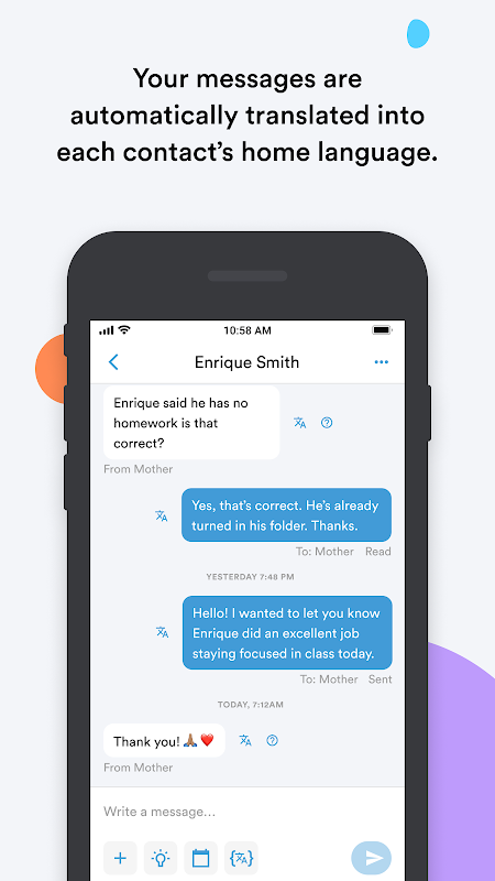 O aplicativo TalkingPoints Teacher ajuda os professores a alcançar todos os familiares e responsáveis, independentemente do idioma, por meio de mensagens de texto em mais de 150 idiomas. Nossa tradução é feita por uma combinação de tradutores humanos e máquinas, permitindo uma comunicação fluida com todas as suas famílias.