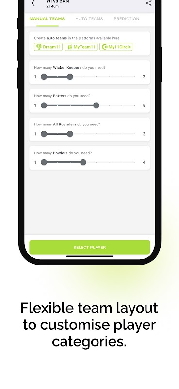🎯 Layout de equipe personalizado: escolha intervalos de jogadores para Wicketkeepers, Batedores, Versáteis e Lançadores.