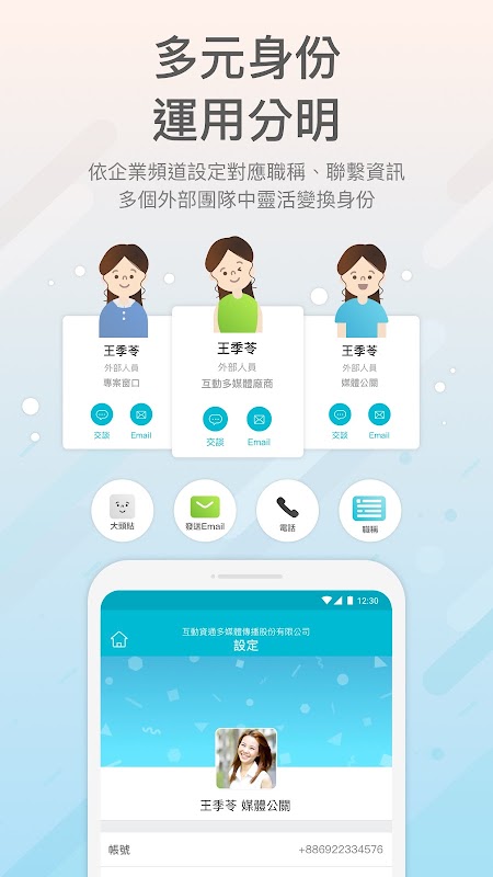 Para os canais corporativos participantes, você pode configurar livremente cartazes, títulos profissionais, e-mails e números de contato, para que possa mostrar as informações e aparência profissional mais adequadas em diferentes parceiros e alterar com flexibilidade suas funções de comunicação externa.