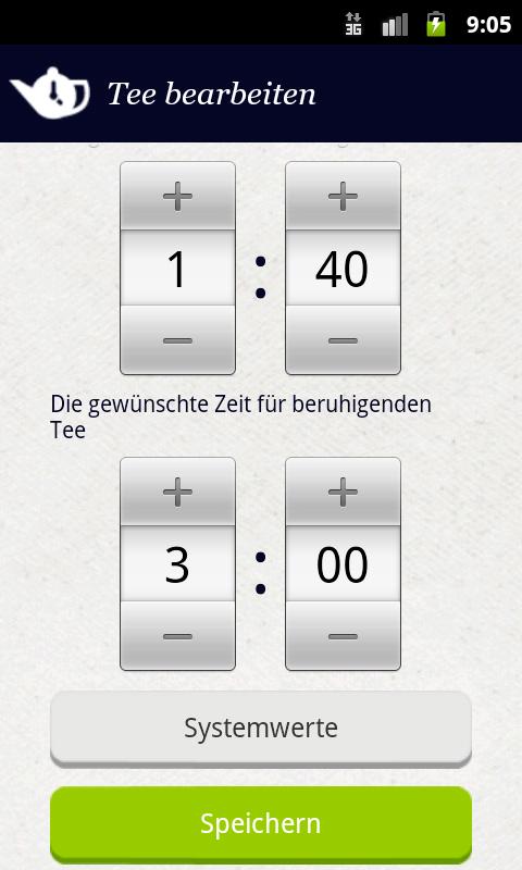TeaTimer permite que você tenha o seu caminho: escolher seus chás favoritos para acesso rápido ou alterar os valores de temperatura, quantidade ou duração para corresponder às suas preferências pessoais. Você também pode adicionar seus próprios chás à base de dados.