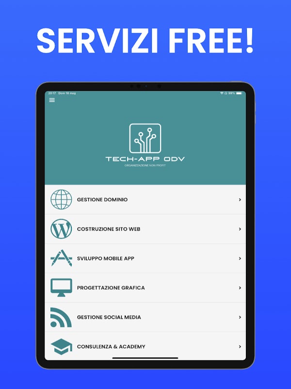 Tech-App OdV é uma organização voluntária que nasceu com a missão de oferecer ajuda concreta e gratuita a todas as organizações sem fins lucrativos como a nossa, como Comunidades Pastorais, Paróquias, Oratórios, Associações e Sociedades Esportivas, Organizações de Voluntariado e Organizações sem Fins Lucrativos, que têm o desejo de se digitalizar e se manterem atualizadas.