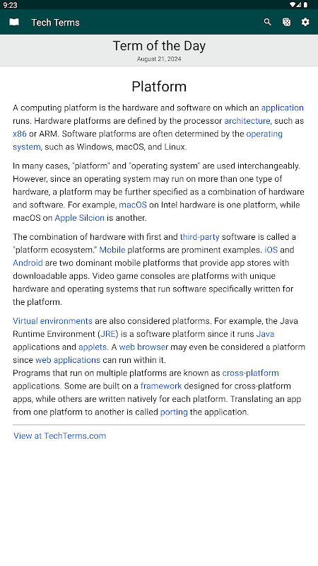 O objetivo do Tech Terms Computer Dictionary é tornar a terminologia informática fácil de entender. As definições são escritas de forma clara e concisa e muitas vezes fornecem exemplos reais de como os termos são usados. Você pode pesquisar e navegar por todo o dicionário, salvar favoritos e voltar todos os dias para ler a definição diária.