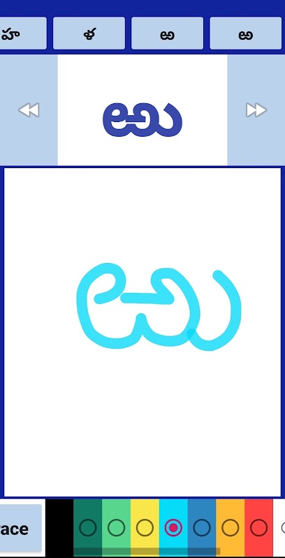 Aprenda a escrever alfabetos Telugu tem botão anterior e próximo para mover para trás e para frente na sequência de alfabetos. As crianças podem excluir se precisarem corrigir a escrita do alfabeto. Para mudar de vogais para consoantes, etc., eles podem escolher entre os botões de opção fornecidos junto com a Letra inicial da sequência. O aplicativo de escrita do alfabeto Telugu fornece três canetas grossas diferentes para escrever a letra de acordo com o desejo das crianças.